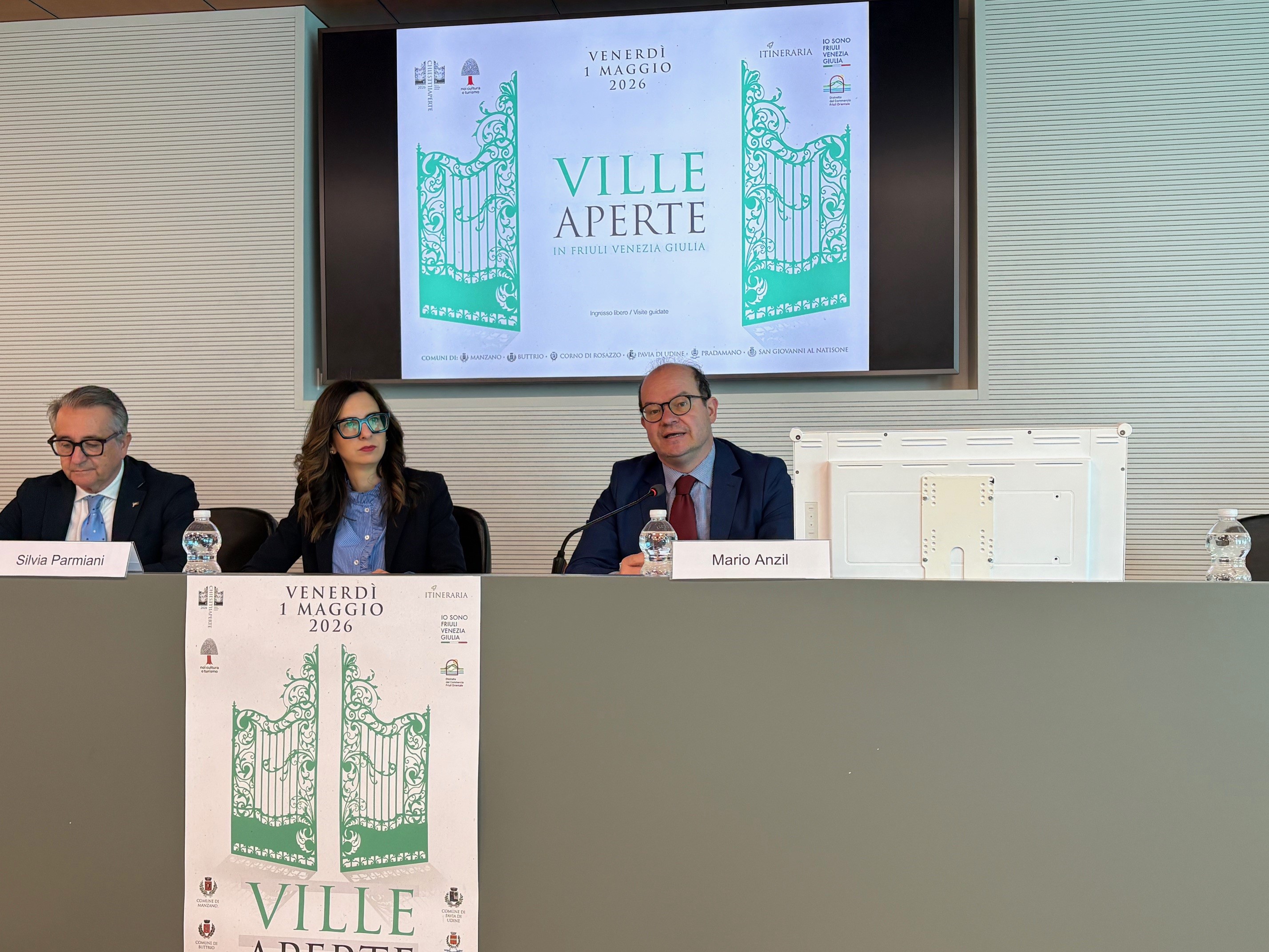 Il vicegovernatore con delega alla Cultura, Mario Anzil, con il sindaco di Manzano Piero Furlani e l'assessore comunale alla Cultura Silvia Parmiani alla presentazione di Ville Aperte in Friuli Venezia Giulia